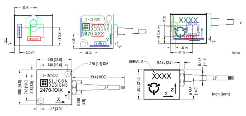 板載電壓調節和內部電壓基準消除了對精密電源的需求。堅固的,陽極氧化鋁的情況下是罐裝的,然后環氧樹脂密封,可以很容易地通過兩個螺絲,粘合劑,或通過附加磁鐵安裝。在外殼上標記各個軸方向,正加速度定義為軸箭頭方向的加速度。