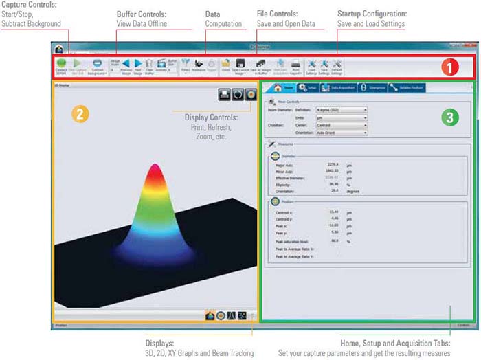3 - 主頁和設置選項卡 —— 軟件右側包含主頁、設置和數據采集選項卡。主頁選項卡允許用戶選擇針對其測量的主要控制(光束直徑清晰度、瞄準器中心和定向),并在其下顯示測量結果。設置選項卡允許用戶設置測量參數(曝光時間、圖像定向和平均值、主動區等),數據采集選項卡允許用戶保存測量值或測量值及完整圖像,并輸入采集的采樣率和總持續時間。單擊計算面板中的顯示/隱藏選項按鈕,還可調出具有控制功能的更多選項卡。