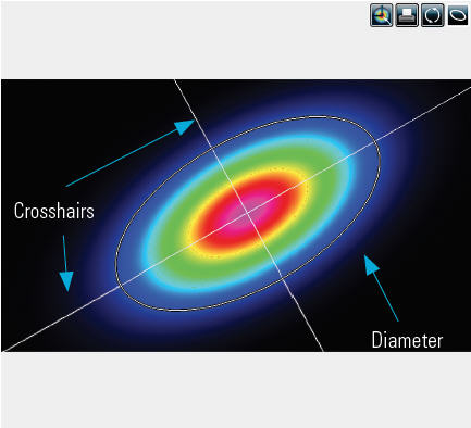 二維顯示屏 —— 二維顯示屏可顯示瞄準器(設置到長軸和短軸或沿指定角度方向)和光束的測定直徑。這些直徑隨所選清晰度(4-sigma、半峰全寬、1/e2 等)而變化,該顯示屏可以打開或關閉。打印屏幕按鈕允許用戶以 BMP 格式保存當前屏幕的圖片。