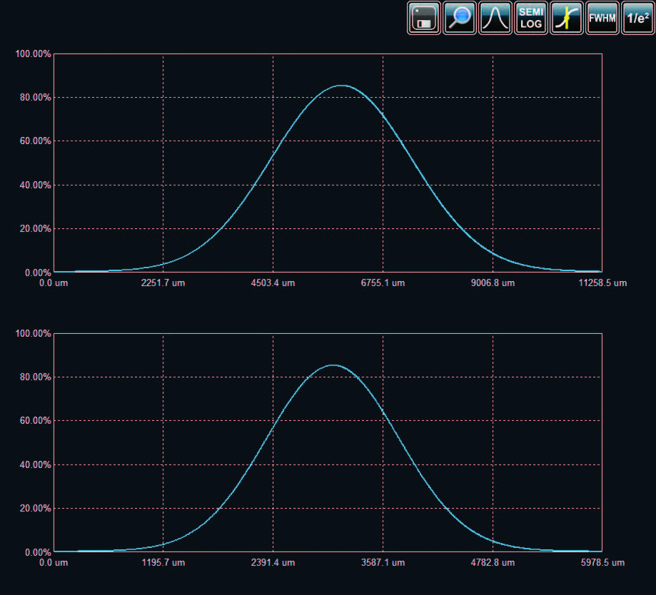 XY 顯示屏 —— XY 顯示屏繪制沿瞄準器的光束橫截面圖。其具有很多有用工具,包括縮放、光標、半峰全寬和 1/e2 級別條。另外還可以半對數格式顯示圖形,以增強光束低強度部分的細節。