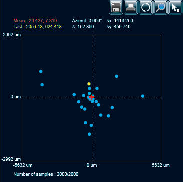 光束跟蹤顯示屏 —— 光束跟蹤顯示屏允許用戶對光束在傳感器上中心位置的變化進行可視化顯示。其可顯示最后計算位置和以前的位置,除非用戶重置視圖。另外還可顯示所有計算值的平均數位置,并提供有關 X 軸和 Y 軸位置穩定性的信息。此工具非常適合于監控光束隨時間變化的指向穩定性。