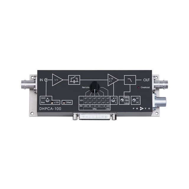 DHPCA-100 的許多特性包括:從 10 2到 10 8 V/A 的可調(diào)增益、可調(diào)偏置和偏移電壓、可切換的 10 MHz 和 1 MHz 低通濾波器、可切換的 AC/DC 耦合以及所有重要的選項可以直接在設(shè)備上或通過數(shù)字接口(例如使用 PC)控制功能。所有這些都安裝在堅固、緊湊且符合 EMC 標準的外殼中,允許直接在信號源進行放大,而無需長電纜或干擾信號。