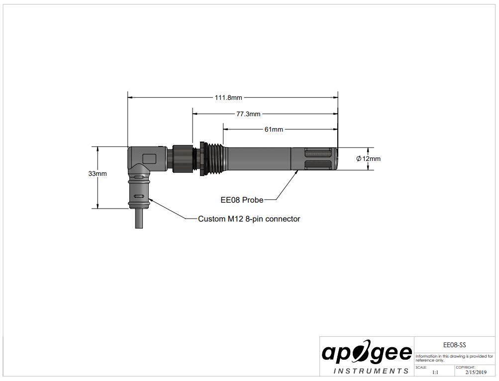Apogee EE08 是奧地利制造商 E + E Elektronik 生產的 EE08 探頭的定制版本。經過多年的評估,EE08-SS 已成為我們在精度、穩定性和耐用性方面優于更昂貴探頭的不二傳感器。Apogee EE08-SS 具有改進的直角、IP67 等級、不銹鋼 M12 連接器;熱反射白色電纜;和更耐用的金屬網格灰塵過濾器。Apogee 添加的這些功能僅略微增加了 E + E 基本型號的價格,但大大提高了性能并減少了探頭的維護,尤其是在與 Apogee TS-100等風扇吸氣式輻射屏蔽一起使用時 。