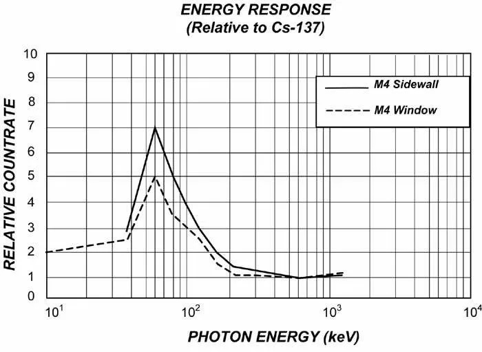 1000 CPM/mR/小時 (Cs137) 檢測低至 2.5 MeV 的 alpha;3.6 MeV 下的典型檢測效率大于 80%。檢測 50 keV 的 β,典型檢測效率為 35%;檢測 150 keV 的 β,典型檢測效率為 75%。通過窗口檢測典型低至 10 keV 的伽馬射線和 X 射線,通過外殼檢測最低 40 keV 的伽馬射線和 X 射線。 ![]() |