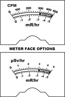模擬儀表在高達 100 倍最大讀數的字段中保持滿量程。CPM 和 mR/小時規模??蛇x SI 刻度計![]() |