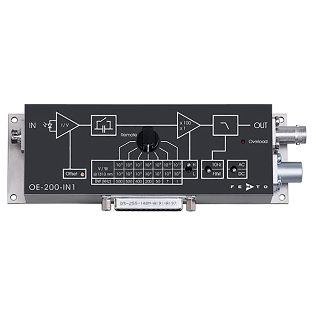 OE-200 系列可變增益光接收器專為需要快速、精確測量小光信號的各種應用而設計。通過將低噪聲跨阻放大器與硅或 InGaAs 光電二極管相結合,可以覆蓋從 190 nm 到 1700 nm 的寬波長范圍。集成放大器提供從 103到 1011的可調增益V/W,因此允許在從 ca 的寬動態范圍內進行測量。100 fW 至 2 mW 光輸入功率。其高靈敏度是通過低噪聲設計實現的,噪聲等效功率 (NEP) 低為 6 fW/√Hz。許多附加功能,如可切換信號濾波器、偏移調整以及通過 PC 進行手動和光隔離遠程控制的能力,使 OE-200 成為同類產品中通用的光接收器。