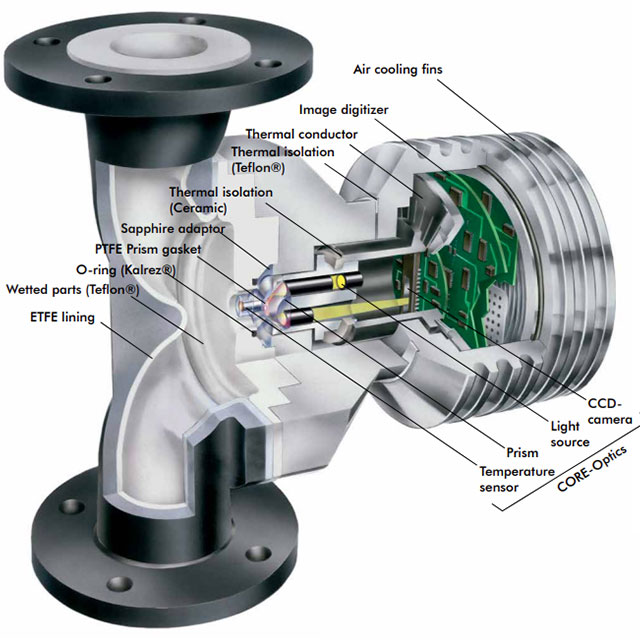 PR-23-W 傳感器接液部件:Teflon®、藍寶石 (Al2O3)、Kalrez® 和尖晶石 (MgAl2O4) 具有良好的化學物質耐受性和機械耐受性;PR-23-M 傳感器接液部件:Teflon® PTFE 或 Kynar® PVDF(聚偏二氟乙烯)、棱鏡墊片 Teflon® PTFE、藍寶石棱鏡、O 形圈 Kalrez 和藍寶石適配器