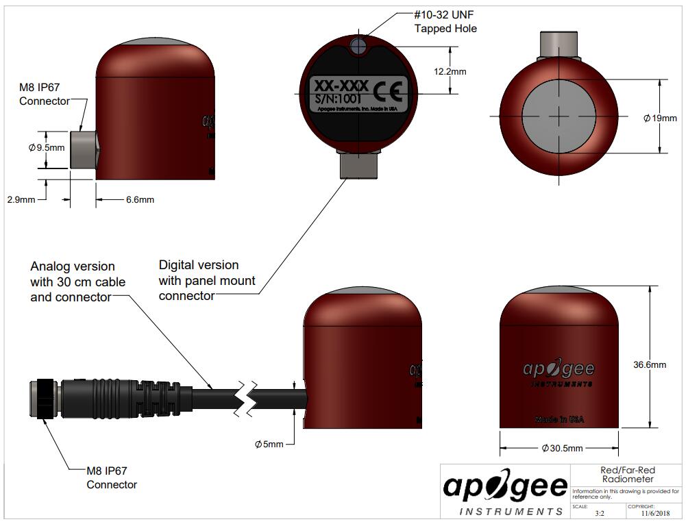 S2-131 紅色 - 遠紅外傳感器是一款雙通道自供電傳感器。該傳感器采用堅固的鋁制外殼,可完全浸入水中,可承受惡劣條件,并采用預鍍錫尾纖引線的高質量電纜端接,可輕松連接到數據記錄器和控制器。傳感器電纜包括一個 IP68 不銹鋼電纜連接器,以簡化從持久安裝中拆卸和更換傳感器以進行維護和校準的過程。典型應用包括測量生態應用的紅光/遠紅光比 (RFR),包括光譜質量對光敏色素的影響。RF 比率會影響植物高度、葉片展開率以及其他光生物學和植物形態發生反應。