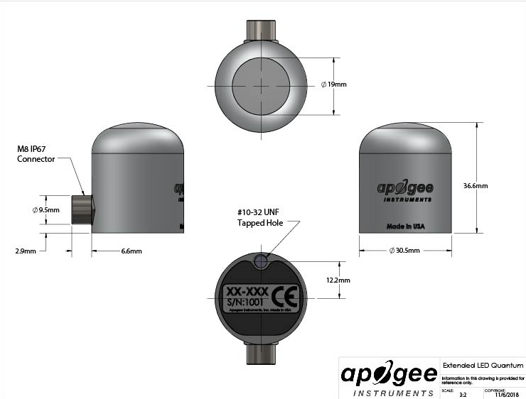 Apogee新的優質ePAR傳感器于2021年推出,是ePFD傳感器的升級版,旨在測量新定義的400-750 nm ePAR輻射范圍,研究表明,該輻射范圍具有光合活性,超出了傳統的400-700 nm范圍。SQ-617 ePAR是一種采用SDI-12通信協議的數字傳感器。該傳感器采用堅固的鋁制外殼,可完全潛水,可承受惡劣條件,高質量的電纜終端采用預鍍錫的pigtail引線,方便連接數據記錄儀和控制器。傳感器電纜包括一個IP68防水的不銹鋼電纜連接器,以簡化傳感器的拆卸和更換,從持久安裝進行維護和校準。ePAR傳感器的典型應用包括測量所有生長環境下植物冠層的ePAR總強度,監測和調整生長光,以及研究植物形態發生活性和光生物學。許多下一代LED燈具、太陽和其他光源發出這些新確認的遠紅光合作用波長,但直到現在,它們還不能用傳統的400-700 nm PAR儀表測量。