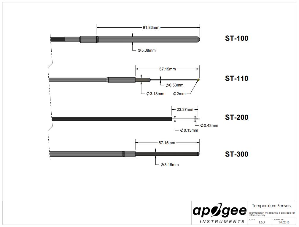 ST-110 是一款高精度熱敏電阻(-40 至 60 C 范圍內為 ± 0.1 C),旨在很大限度地減少太陽能負載和熱傳導。在熱敏電阻后面的電纜上使用白色熱縮管以減少太陽能負載。康銅線用于很大限度地減少沿著電線向熱敏電阻的熱傳導。ST-110 設計用于在 Apogee 的 TS-100 吸氣輻射防護罩中進行空氣溫度測量,也可用于其他公司的靜態多板防護罩。