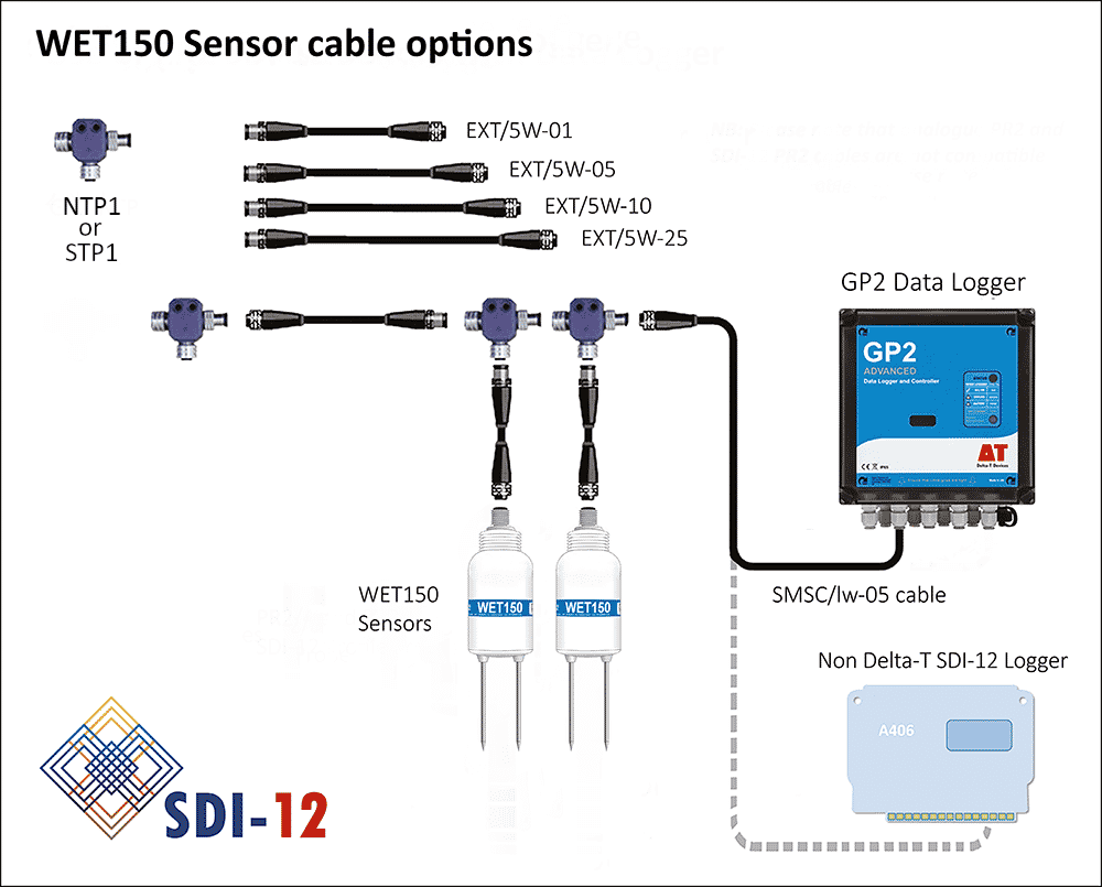 最多 62 個 WET150 可以連接到單個 GP2 SDI-12 數(shù)據(jù)記錄器(取決于電纜長度和電源要求)。