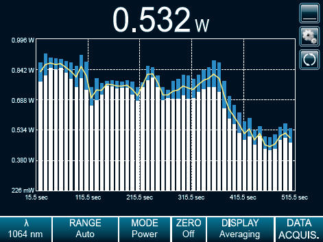 這個非常特別的模式特別適用于顯示激光器隨時間的變化趨勢。設置每批的點數,然后讓 MAESTRO 確定每批的最小值和最大值。每批的平均值之后會出現一條黃色曲線,其在屏幕上顯示為條形。條形白色和藍色部分(分別對應最小值和最大值)相差越大,激光器的穩定性越差。