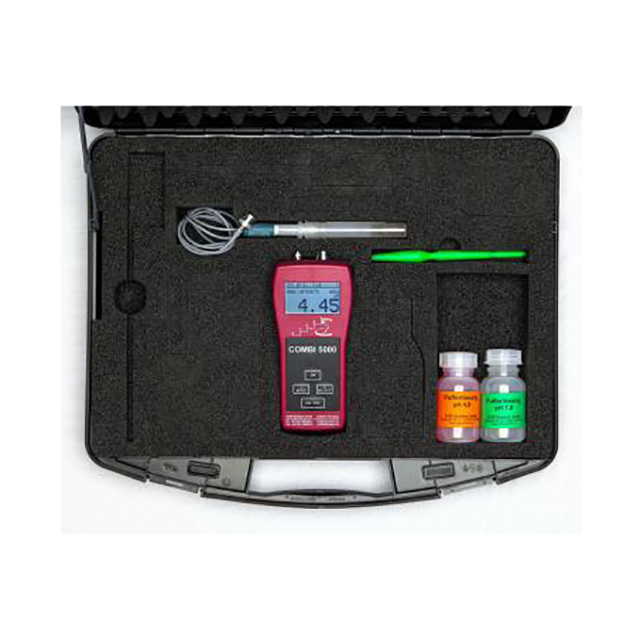 pH 5000 基本設備包括數據記錄器功能、pH 穿刺探針、pH 4 和 7 各 100 毫升的緩沖溶液、穿刺心軸、帶有指導值的操作說明、堅固的箱子。