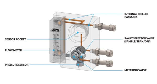 ELIMINATOR CELL BLOCK | Contains a Complete Sample System with all components fully integrated, including the flow meter, metering valve and 4-way Selection (ON/OFF) Valve | |