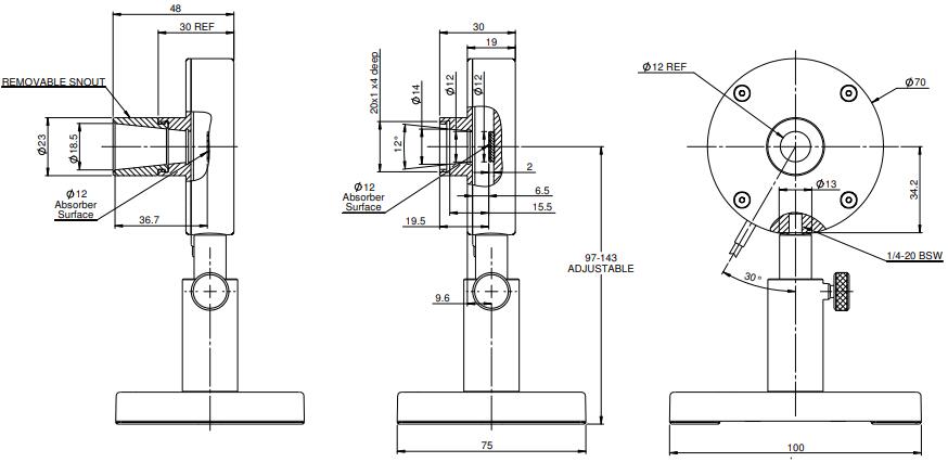 The 3A-PF-12 is a very sensitive thermal power/energy laser measurement sensor for short pulsed lasers. It has a 12mm aperture. It can measure from 15μW to 3W and from 20μJ to 2J. It has a damage threshold of up to 1.5J/cm2 for ns pulses and covers the spectral range from 0.15 to 20μm. The sensor comes with a 1.5 meter cable for connecting to a meter or PC interface.