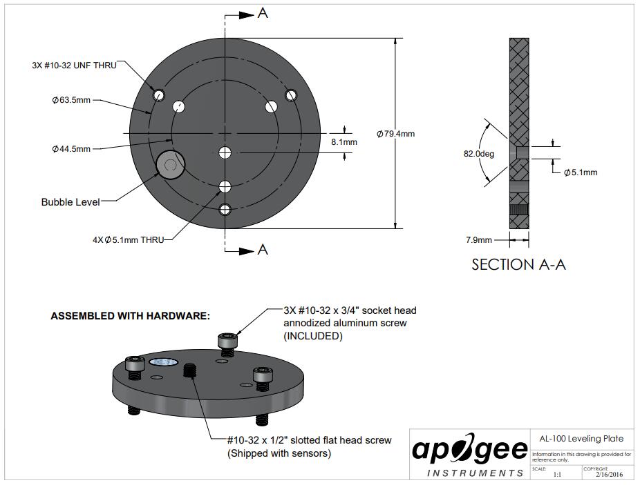 AL-100 horizontal plates are designed to be flat or mounted to surfaces, such as wood. The horizontal plate can accommodate the solar radiation sensors of all Apogee instruments, such as the total radiation meter, quantum sensors, etc. Proper sensor installation requires that the sensor be as horizontal as possible in most applications. The leveling plate contains an integrated bubble level, which is designed to work between - 29 and 55 ℃, making leveling simple and accurate.