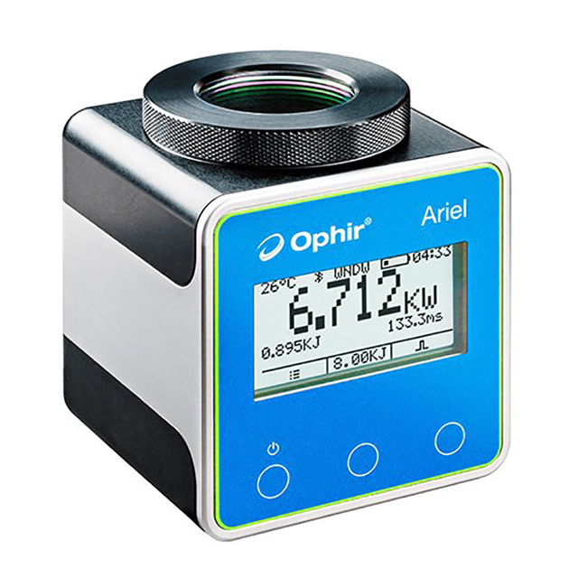 In ‘power-from-pulse’ mode, the Ariel measures high power industrial lasers of up to 8kW by measuring the energy of a short exposure to this power. The laser is set to deliver a pulse of from 0.05 to several seconds. The Ariel then measures the energy and duration of the laser pulse and calculates the power. In continuous mode, the Ariel measures up to 500W for as long as 20s, or up to 30W continuously. The Ariel is ideal for usage in tight spaces such as additive manufacturing chambers as well as for production process quality control and R&D.