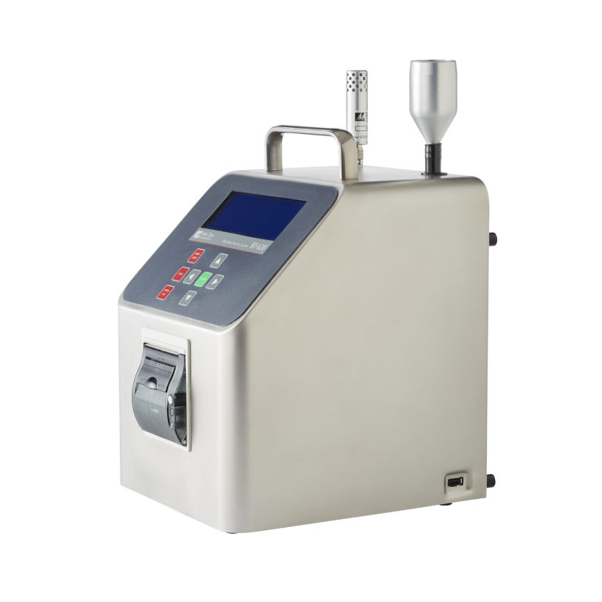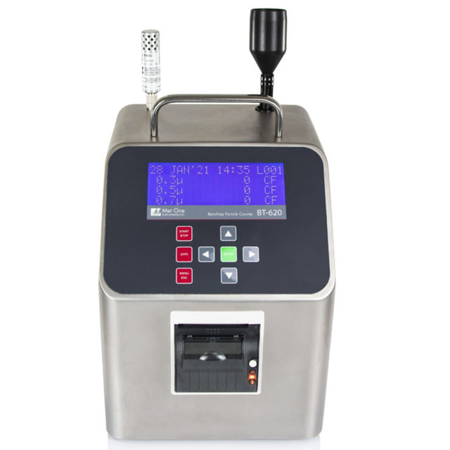 The BT-620 is a compact, battery-operated particle counter with six selectable size channels, an integrated printer, and housed in a portable stainless-steel case. The device’s flow rate is 1.0 CFM (28.3 LPM) and is maintained with volumetric flow control for improved accuracy. This benchtop particle counter has a large, easy-to-read display, audible alarms, and an internal printer that work together to verify particulate levels. If the particle count exceeds the user’s pre-set limit, the audible alarm will sound, and the screen display, sample history, and printout will indicate an alarm event. Two programmable count alarm limits may be set.