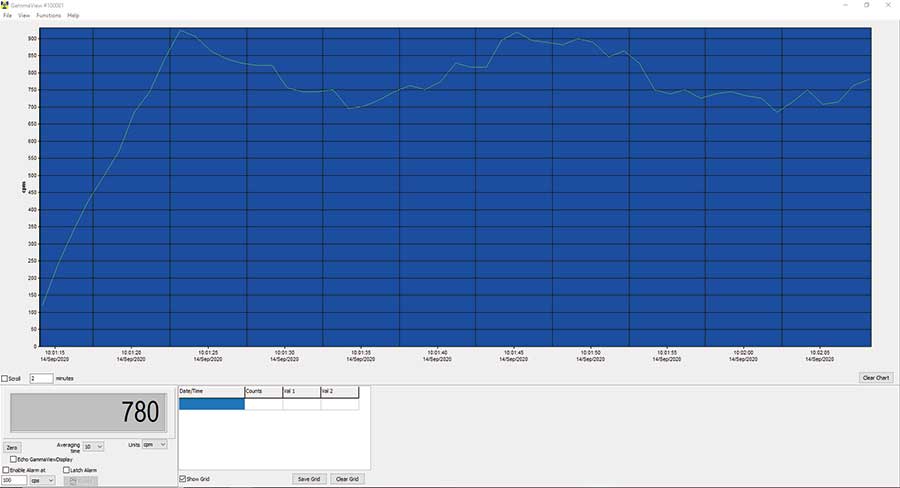 The Observer USB Software reads in Total Counts, CPM,μR/hr, mR/hr, CPS, μSv/hr, and has the ability to collect, log the data received, set the calibration date and settings, and echo the readings collected on a PC. The data is displayed on a graph, as well as a digital on-screen meter. Data can be saved or printed in various ways, including a spreadsheet format. The dwell/count time can be adjusted for each point on the graph and the length of time for the count can be set . The software display has adjustable settings as well as a settable alarm.