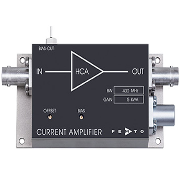 Adjustable offset and offset voltageTo achieve high flexibility, FEMTO's HCA current amplifier provides accurate offset and bias control via two fine-tuned potentiometers. A wide range of adjustable input offset current compensation ensures a complete dynamic range, even for signals with large DC components. The voltage at the offset output can be accurately set to -12 to +12 volts using a multi-turn bias fine-tuning potentiometer. This is a simple and effective way to bias photodiodes, so they can achieve short rise times for fast measurements.