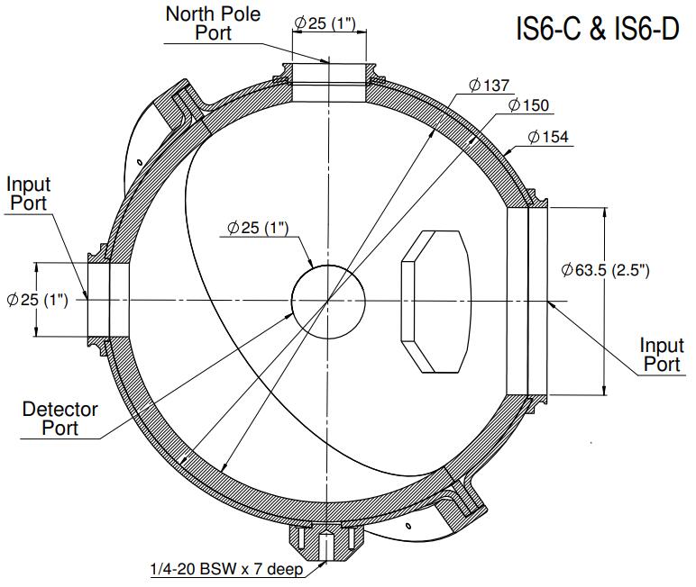 The IS6-D is a 6” integrating sphere (5.3” inside) for use with divergent (D) beams. It has no detectors, where the detection configuration for the IS6-D is done by the user. It can also be used as a uniform light source.