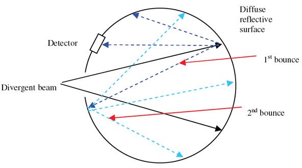 The integrating sphere is used to measure divergent light sources. As shown in the figure, the inner surface of the integrating sphere is coated with a highly reflective (usually 99%) surface in a scattering, non mirror way. Therefore, when the divergent beam hits the integrating sphere wall, the light will be reflected and scattered many times until the light hitting anywhere on the sphere wall has the same intensity. Therefore, the detector placed in the sphere obtains the same intensity as anywhere else, and the power detected by the detector is proportional to the total incident power unrelated to the beam divergence. (The detector is arranged so that it can only see the scattered light, but not the incident beam.) An ideal integrating sphere has a surface with Lambert reflection characteristics. This means that the light incident on the surface is uniformly scattered in all directions of the 2 pi spherical solid angle above the surface. The surface used in the Ophir integrating ball head is very close to the Lambert surface.