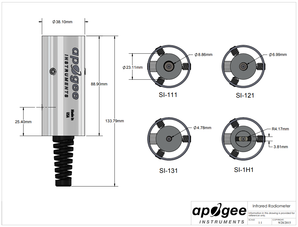 The MI-220 has a hand-held meter, attached via cable, that displays and stores sensor measurements. The sensor has a 18° half-angle field of view and a response time of 0.6 seconds. Typical applications include plant canopy temperature measurement for use in plant water status estimation, road surface temperature measurement of determination of icing conditions, and terrestrial surface (soil, vegetation, water, snow) temperature measurement in energy balance studies.