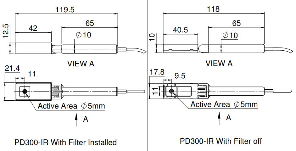 The PD300-IR is a photodiode laser measurement sensor for the near IR. It has a 5mm aperture with swivel mount and a removable filter. Without filter, its spectral range is from 700 to 1800nm and its power measuring range is from 5nW to 30mW. With filter the spectral range is 700 - 1800nm and the power range is 200μW - 300mW. The sensor comes with a 1.5 meter cable for connecting to a meter or PC interface.