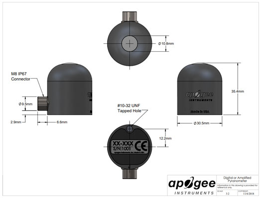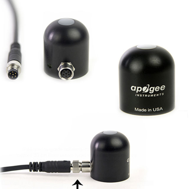 Apogee Instruments SP series pyranometers consist of a cast acrylic diffuser (filter), photodiode, and signal processing circuitry mounted in an anodized aluminum housing, and a cable to connect the sensor to a measurement device. Sensors are potted solid with no internal air space and are designed for continuous total shortwave radiation measurement on a planar surface in outdoor environments. SP series sensors output an analog voltage that is directly proportional to total shortwave radiation from the sun. The voltage signal from the sensor is directly proportional to radiation incident on a planar surface (does not have to be horizontal), where the radiation emanates from all angles of a hemisphere.