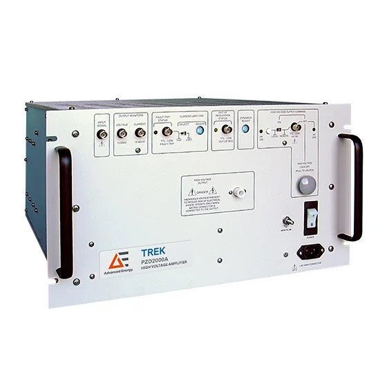 The Trek PZD2000A high voltage power amplifier incorporates an all-solid-state design for high reliability and low-noise operation. Its four-quadrant output stage sinks and sources the load current throughout the output voltage range. This enables accurate output responses and high slew rates into highly capacitive loads. The output stage is fully protected against overvoltage and overcurrent conditions generated by active loads, overloads, or arcing to the ground.